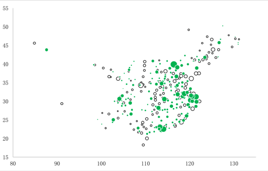 时变数据通常具有线性和周期性两种特征,需要依此选择不同的可视化方法。时变数据可视化采用多视角、数据比较等方法体现数据随时间变化的趋势和规律。如图1-10是2020年城市科技创新发展指数经纬度分布图,其中:横坐标表示经度,纵坐标表示纬度,图中点越大表示城市科技创新发展水平越高,绿色点表示城市科技创新发展水平排名较2019年上升或不变,白色点表示城市科技创新发展水平排名下降。