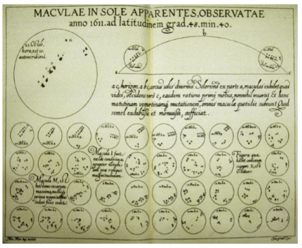 17世纪最重要的科学进展是物理基本量(时间、距离和空间)的测量理论与设备的完善。这些理论和设备被广泛应用于航空、测绘、制图和国土勘探等领域。图1-4诞生于1626年,描绘了太阳黑子随时间变化的情况。这幅图包含多个小图,用来刻画不同时间段的太阳黑子。
