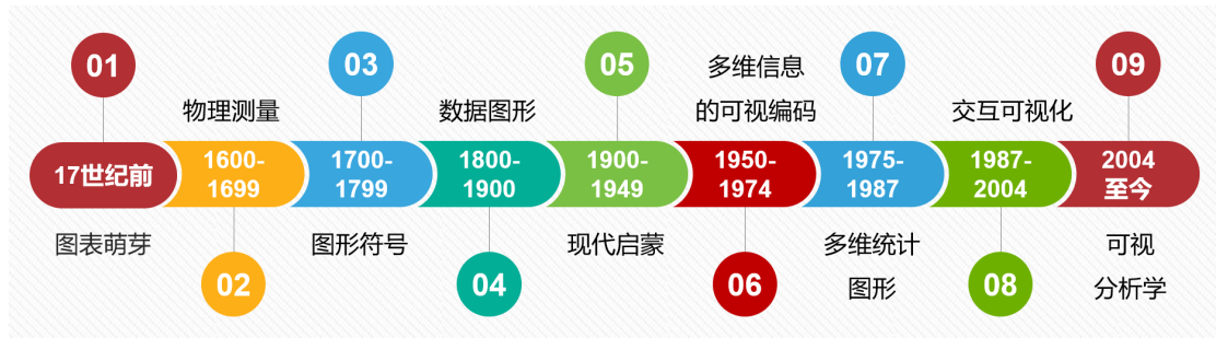 在工作和生活中,一张图片所传递的信息往往比文字更直观。因此,自古以来,记录信息的有效方式之一就是用图形的方式描述各种具体或抽象的事物。数据可视化有着非常久远的历史,其发展历程主要经历了9个阶段: