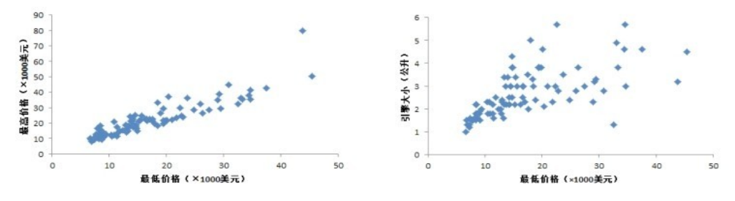 位置关系能够帮助揭示数据间的关系。例如,数据是否主要集中在某一范围,数据分布是否符合一定的统计规律,数据间是否表现出特定的趋势等等。图2-21显示了两个简单的图表例子,通过点之间的位置分布,我们很容易就可以发现不同属性间的联系。在图2-21中,左、右两图都显示了同一组1993年汽车数据中的部分属性。其中,左图显示了不同汽车的最低价格和最高价格的散点图,从点的分布情况来看,这两个价格之间呈线性关系;右图显示了最低价格和引擎大小之间的关系。与左图不同的是,右图揭示两个属性之间没有很强的联系。