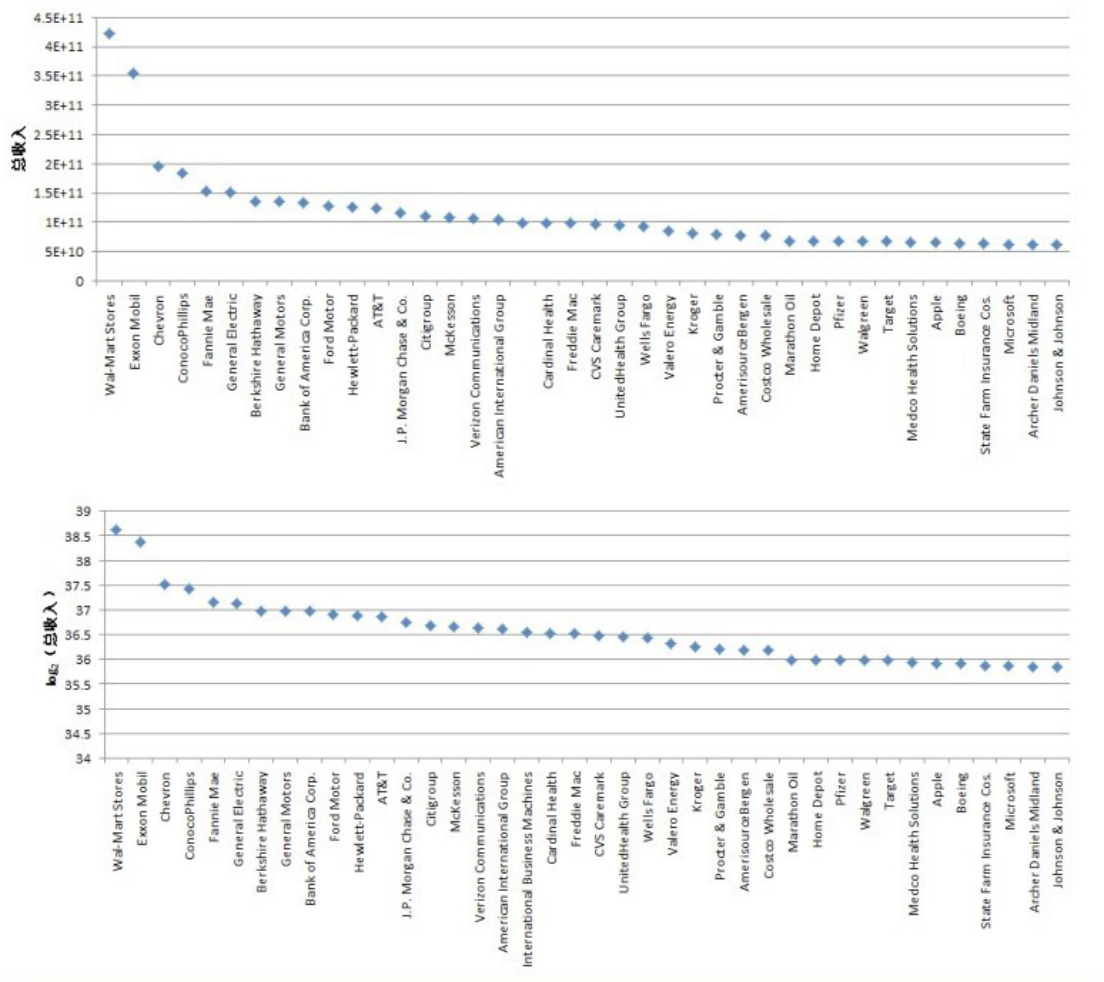 图2-22世界500强中前40名公司的2011年总收入的两种可视化