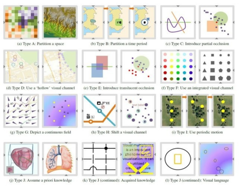 视觉多通可以理解为可正确解码的多可视信息的堆叠方式。也就是说,把不同视觉通道(颜色、大小、形状等)通过合理的组合方式编码在一起,使得用户能够正确地解码出可视元素所蕴含的信息。这篇论文提出了视觉多通的理论框架,并把组合方式分为12类,如图2-30所示,分别为: