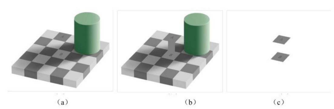 一些视觉实验表明,感知系统对于亮度和颜色的判断完全是基于周围环境的,即人眼是通过与周围亮度和颜色的对比获得对焦点处亮度和颜色的感知的,因此在这种情况下,视觉假象将更加突出。例如,图2-18(a)为美国麻省理工学院教授EdwardAdelson发布的一个阴影假象图像,被标记的两个正方形格子A和B看上去具有明显不同的灰度(B比A亮)。然而,通过增加一个灰色条带连接A和B(见图2-18(b))或覆盖图中除正方形A和B以外的区域(见图2-18(c)),可以发现,正方形A和B实际上具有相同的亮度。这主要是因为,人们对于色块A和B的亮度的判断完全是基于它们的周围色块进行的。人们对于颜色的判断也会受到周围环境的影响。