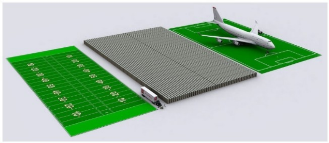 图2-16相对判断:将等同于美国政府财政赤字的1万亿美元现金堆叠形成的方块(墨绿色),和标准美国橄榄球场(左)、波音747飞机(右)进行对比,形象直观。