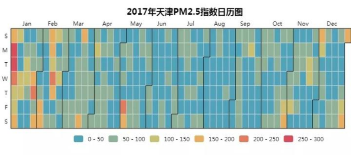 数据可视化的趋势之一就是简化。在某些方面,这可能是对复杂的可视化的一种解决方案。而且,简单的可视化效果在手机上往往呈现得更好。2017年天津PM2.5指数日历图就是一个很好的例子。图9-5由12个月份每一天的PM2.5指数组成,用不同颜色图例显示PM2.5变化情况。在这张图中日历就是数据可视化简单而又强大的表现方式。