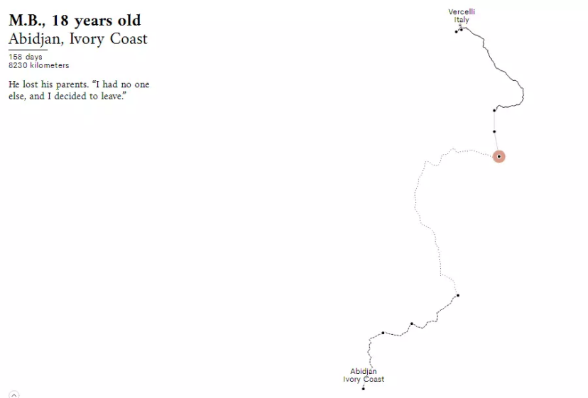 金融时报的数据可视化记者JanePong在2017年全球深度报道大会说到:“我们并不会经常把数据和情感联系在一起,但是将数据和情感一分为二在很大程度上是错误的。”数据可视化可用来迎合人们的情感,让他们能够更好地认识主题。FedericaFragapane和AlexPiacentini的“路线背后的故事”就是一个很好的例子,这是一个有关追踪六名寻求庇护者前往意大利的视觉故事。Pong说:“这只是一份数据,但是它展现出了很多的细节,并鼓励读者参与到故事中来。”
