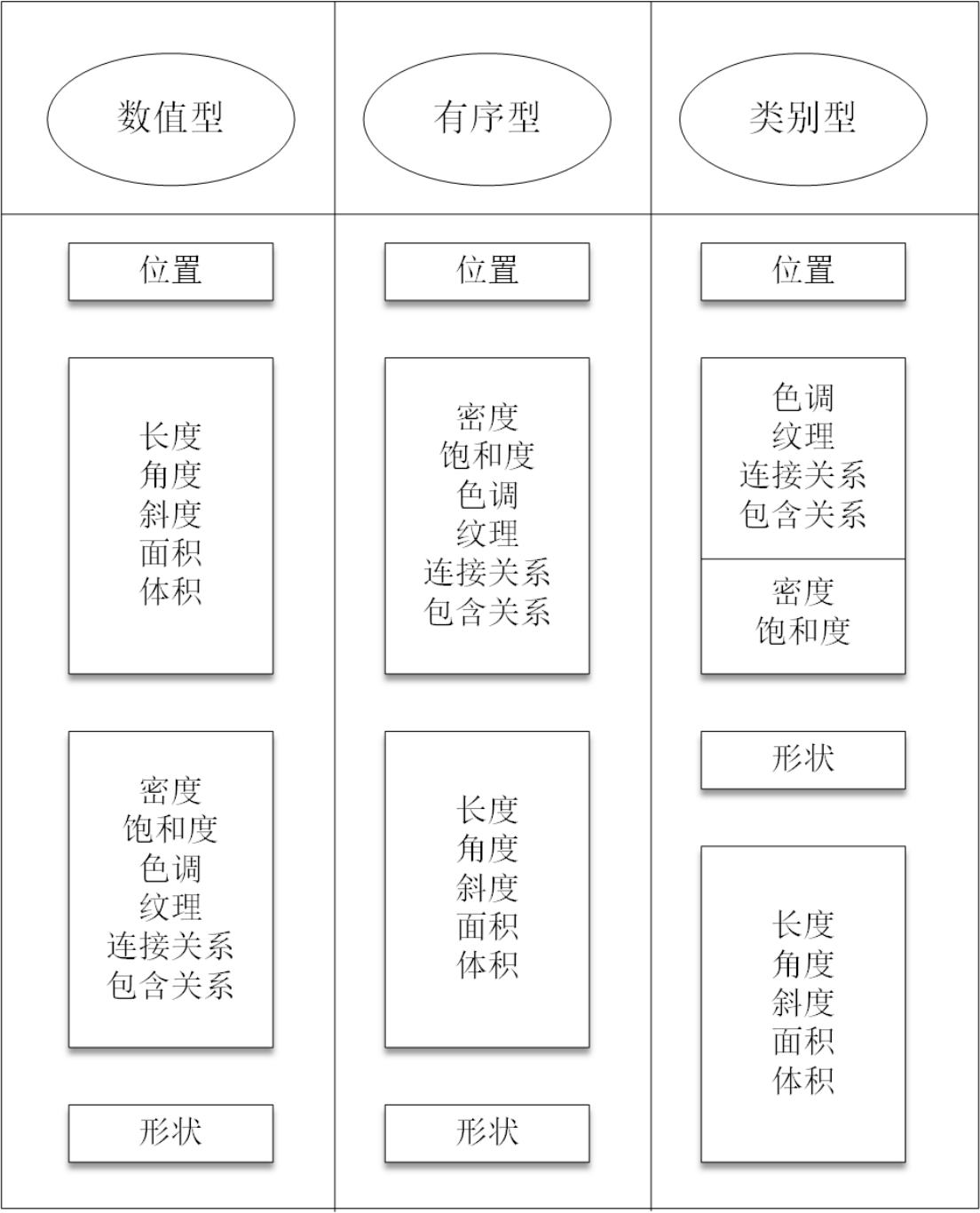 数据到可视化元素的映射需充分利用已有的先验知识,从而降低人们对信息的感知和认知所需要的时间。对于基本数据类型,可以通过使用不同的视觉编码通道来表达数据及其之间的关系(见图3-1)