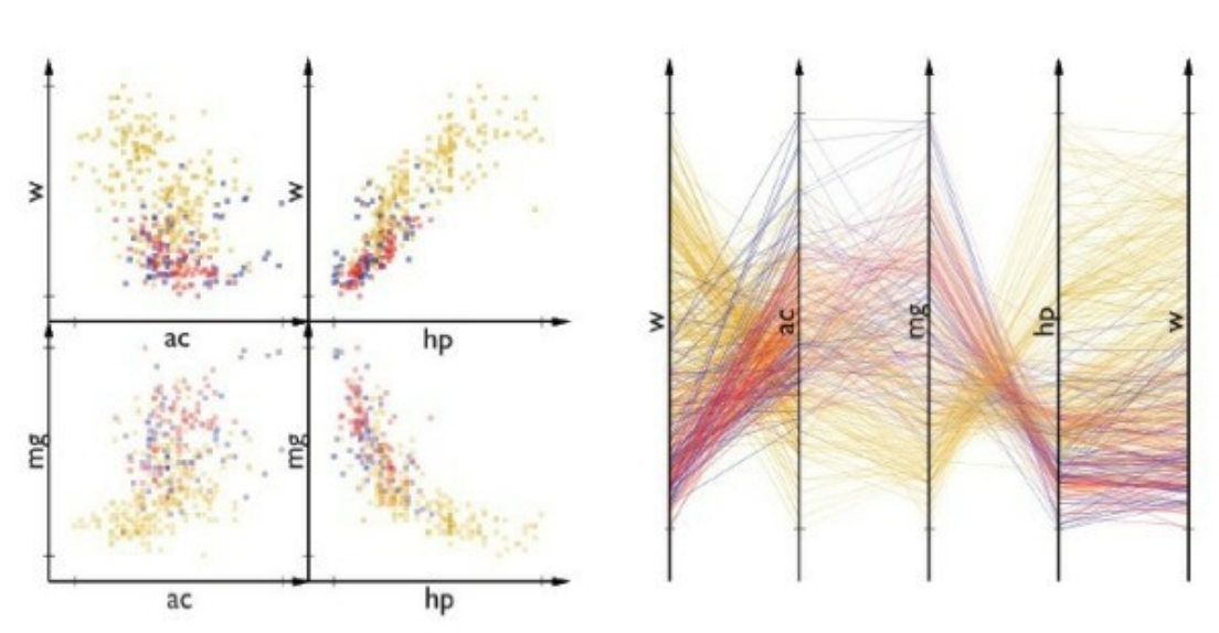 图3-4对一个四维数据的两种可视化方法:散点图和平行坐标
