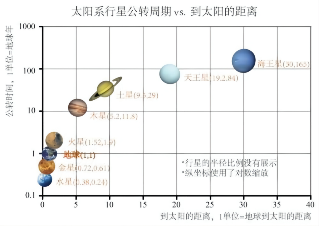 图3-2使用散点图的形式可视化行星到太阳的距离和行星公转时间