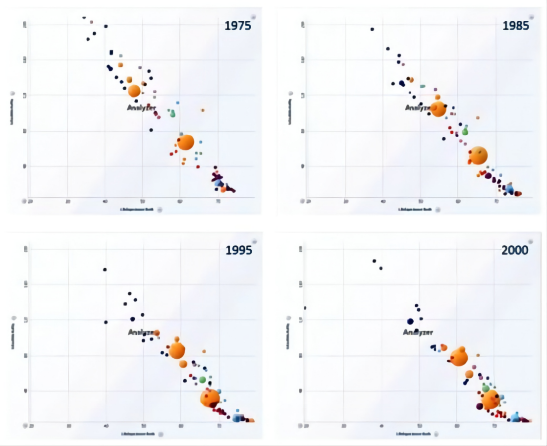 在时序数据的可视化中,数据值随时间变化。如果每一时刻仅包含一个维度,该维度和时间维度则可以组成一个二维空间,用类似坐标轴的方式编码数据值,其中横轴代表时间的渐变。当数据包含多个维度时,需要通过多个视觉通道编码不同的维度信息,此时如果采用动画的方式编码随着时间演进而产生的数据值变化,则可以在有限的视图空间上展示更多的信息,同时也确保任何单一时刻时可视化结果对有限视图空间的充分利用。图3-9展示了类似GapMinder软件(http://www.gapminder.org)可视化效果的动画序列的其中4帧,呈现了75个国家在25年中平均寿命和婴儿平均死亡率的关系变化。