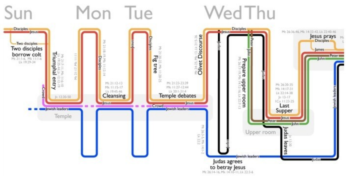 图3-3复活节前一周耶稣活动记录的可视化(部分)。全周时间沿横轴从左到右布局,灰色长方块区域表现了空间,不同颜色的管道线的位置远近编码了人物之间的互动
