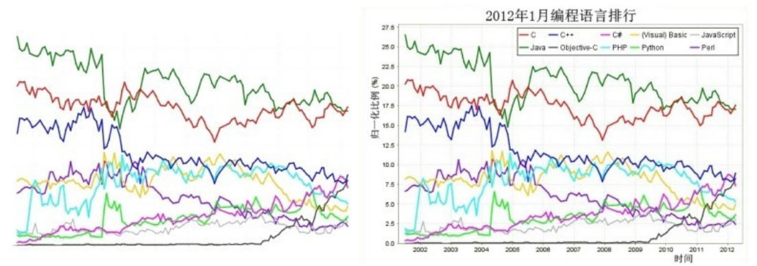 在可视化设计中,仅仅完成上述的交互操作仍然无法形成有效的可视化,用户可能仍然无法从可视化结果中获取足够的信息以判断和理解其包含的内容。例如,在没有任何标注的坐标轴上的点,用户既不知道每个点的具体的值,也不知道该点所代表的具体含义。解决这一问题的做法是给坐标轴标记尺度,然后给相应的点标记一个标签以显示其数据的值,最后给整个可视化赋以一个简洁明了的题目。如图3-5,左图只是简单地完成了数据到可视化(位置和颜色)的映射,然而在用户看来,它仅仅是几条不同颜色的曲线;右图则是一个较完整的可视化,通过增加坐标轴、颜色和尺寸等的标注和说明,用户就能知道这10条曲线的信息含义。