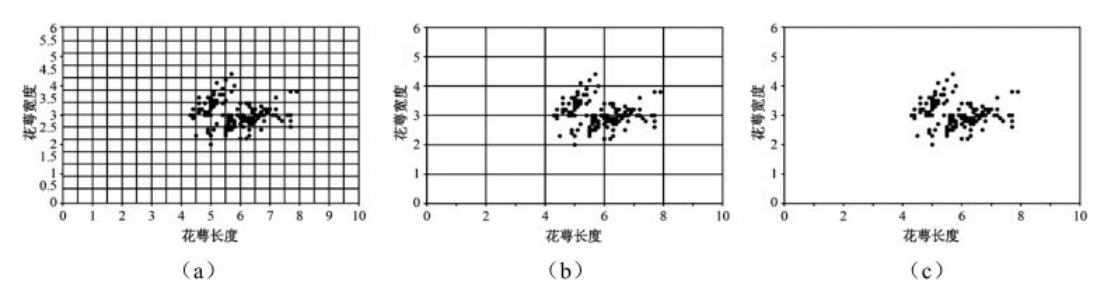 设计者通过在水平和竖直方向增加均匀分割的网格线,提高用户对该可视化结果中曲线上的点所表示的数值进行对比时的精度。设计者需要认真仔细地对待可视化设计中的网格及其标注。如图3-6展示了网格及其标注是否被合理使用的例子,过于稠密的网格(左)和过于稀疏的网格(右)都不利于用户对于数据的理解。甚至,当网格稠密到一定程度后,用户将无法分辨可视化结果中的数据所表示的点。网格的过多使用和过少使用,使得可视化结果在缺少数据表达的精确性的同时也缺失了美观性,而图中(b)通过网格的合理使用,数据所映射的点能够被用户很好地理解。