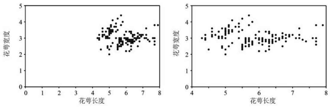 另外,网格所表示的区间的均匀性对于用户对可视化的理解也非常重要,图3-7左图所示的可视化结果中由于设计者使用了不均匀的网格间距(横轴)和非零的起始位置(纵轴),使得用户对可视化结果的理解很难忠于原始数据所包含的信息。使用非均匀的网格间距可能会导致用户对于数据的误读,例如,某一区间的数据斜率将无法通过线段的倾斜程度进行理解和比较。