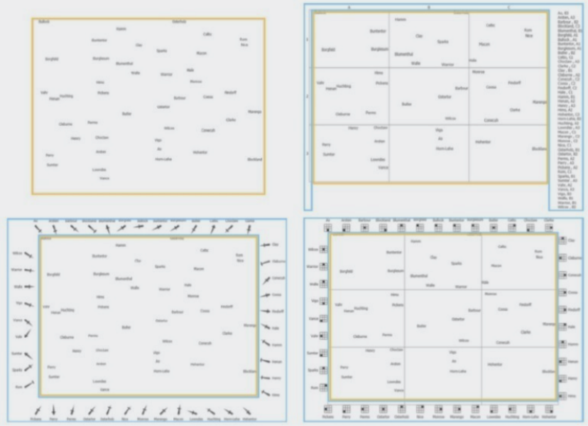 网格参考标注(GA):通过2D笛卡儿坐标系将地图分成多个小单元,并基于行列对小单元编号。在地图外,在每个区域名字旁边会给出它所在位置的单元编号,如“A3”。