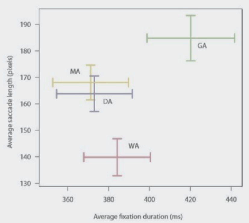 图8-134种标注方法的平均注视时间(x轴)和平均扫视长度(y轴)。误差条显示眼动数据平均值的标准差(SEM)。
