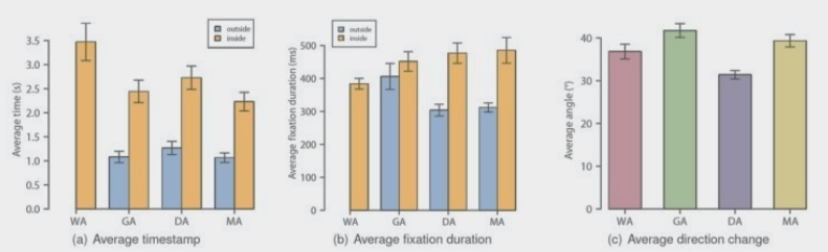 (5)在注视内部区域时,使用DA方法的扫视运动模式不同于GA和MA方法。使用DA方法时,参与用户的目光会沿着一条线定向搜索;而使用GA和MA方法时,参与者会在某个格子中搜索。因此,在后续扫视中,比起GA和MA方法,DA方法将会有更小的角度偏差。