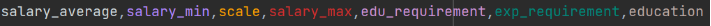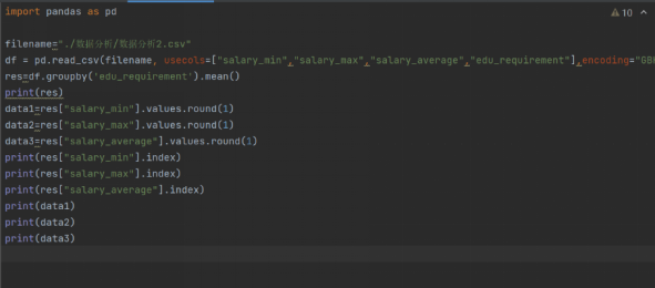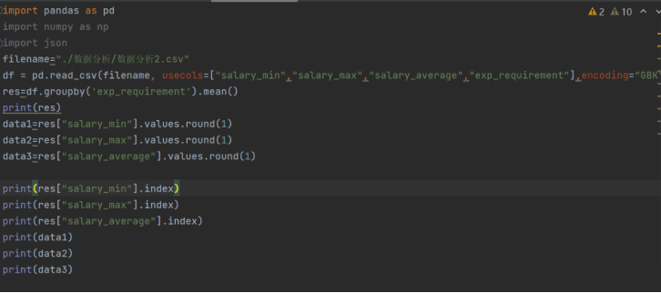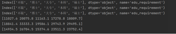 c.不同学历对应的工资分布:首先借助excel新增一列平均工资数据((最低工资+最高工资)/2),再以学历为分组依据,对最低工资,最高工资,平均工资进行平均值计算。最后,获取控制台打印结果。