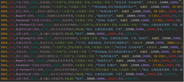 (3)累计爬取数据分析相关岗位3868条数据,涵盖十二个城市,覆盖十五个字段。