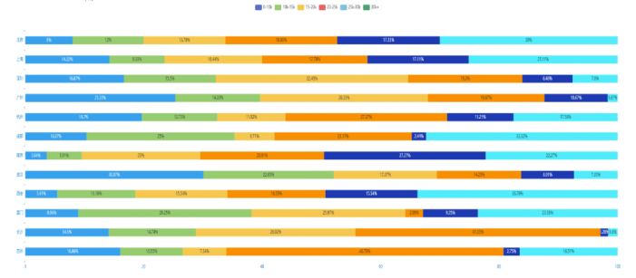 (4)通过堆叠图可以发现,在互联网热门城市当中,每个地区的工资分布均有各自特色。成都和西安地区工资达30k+的岗位占到百分之三十以上,说明该地区对高等数据分析人才需求旺盛。苏州地区工资20-25k的岗位数量达百分之四十五,说明该地区对中等数据分析人才需求旺盛。这些数据为数据分析师在选择工作地区时能提供一定帮助。