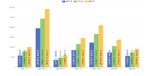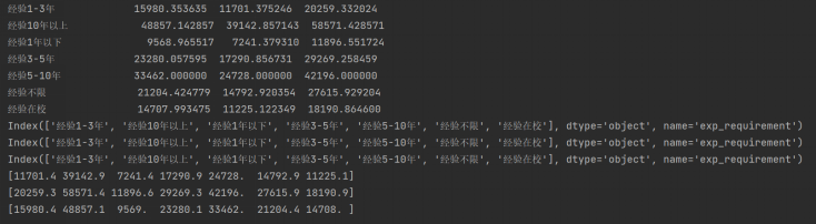 d.不同工作经验对应的工资分布:以工作经验为分组依据,对最低工资,最高工资,平均工资进行平均值计算。最后,获取控制台打印结果。
