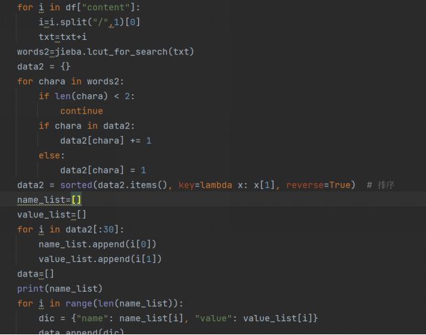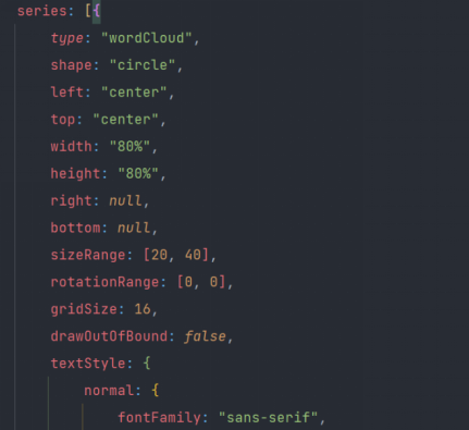首先下载并引入对应的词云图包,再将进行处理后的json数据导入data当中,利用echarts模块生成对应词云图。下图为部分代码。