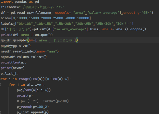 首先对同地平均工资进行分类,分布梯度为[0,10000,15000,20000,25000,30000,100000]。然后通过嵌套遍历的方式,获取对应的数据。