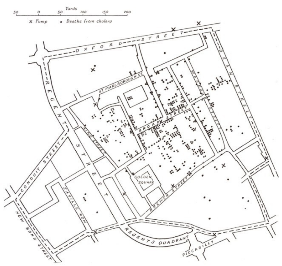 由于可视化可以清晰地展示证据,它在支持上下文的理解和数据推理方面也有独到的作用。1831年起,欧洲大陆暴发霍乱,当时的主流理论是毒气或瘴气引起了霍乱。英国医生JohnSnow着手研究1854年8月底伦敦布拉德街附近居民区爆发的一场霍乱。Snow调查病例发生的地点和取水的关系,发现73个病例离布拉德街水井的距离比附近其他任何一个水井的距离都更近。在拆除布拉德街水井的摇把后不久,霍乱停息。Snow绘制了一张布拉德街区的地图,标记了水井的位置,每个地址(房子)里的病例用图符显示。图符清晰地显示了病例集中在布拉德街水井附近,这就是著名的鬼图(GhostMap)。