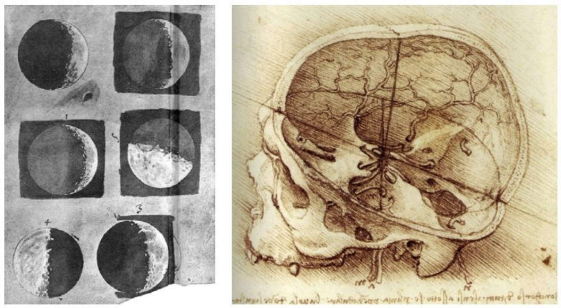 图1-18左:1616年伽利略关于月亮周期的绘图;右:达芬奇绘制的人头盖骨可视化。