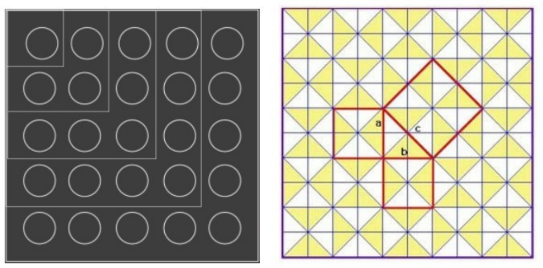 图1-21可视化可有效地扩充记忆和内存空间,从而辅助图形化计算。左:对奇数的和的可视化,1+3+5+7+9=25。