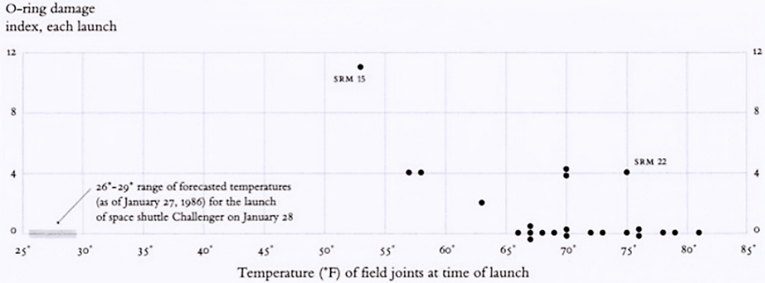 “挑战者”号爆炸事故的直接起因是两个O形密封圈的故障。事后调查总统委员会的报告提道:信息沟通渠道的障碍导致做出了错误的发射决定。这一决定建立在不完全甚至是使人容易误解的信息基础之上。根据以往记录,这种O形密封圈成功飞行的最低气温是华氏53度,实验测试成功的最低温度是华氏25度。在发射之前,生产商与NASA进行了三次电话会议,生产商工程部门提出了气温过低的担心。工程师建议在高于华氏53度的情况下发射,但是NASA对工程师所设定的温度下限(华氏53度)不能理解和接受,生产商则始终难以说服NASA。事实上,在生产商提交NASA的图表上,工程师只列出了橡胶圈爆裂的情形,虽然简单明了,却没有足够的说服力。