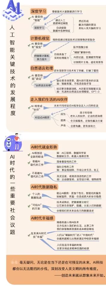 在第一部分,我们说的是,支撑人工智能的那些关键技术,到2042年会发展到什么程度。主要讲了深度学习、计算机视觉、自然语言处理这几种技术,并且看到了,未来将逐步走入我们生活的AI伙伴。除了这些之外,书里还提到了XR拓展现实技术、自动驾驶、量子计算等其他与AI领域相关的前沿技术,感兴趣的朋友,可以点开文稿末尾的电子书,进行拓展阅读。