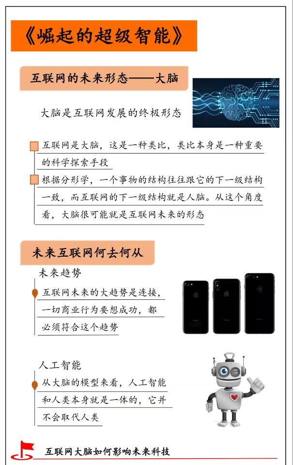 到这里,这本《崛起的超级智能》的精华内容,已经为你解读完了。咱们今天一共说了两部分内容。第一部分,我们推导了互联网大脑模型的成立基础,并且借着推导的过程,了解了类比法在科学探索中的应用,还顺便了解了分形学。从某种程度上看,互联网是人类大脑的延伸,而且根据分形学,事物的上一级结构,往往跟下一级结构一致。我们可以从侧面佐证,互联网的大脑模型,有它的合理性。第二部分,我们从大脑模型的角度出发,观察了互联网行业的趋势,和人工智能的前景。这部分刚说完,就不再重复了。