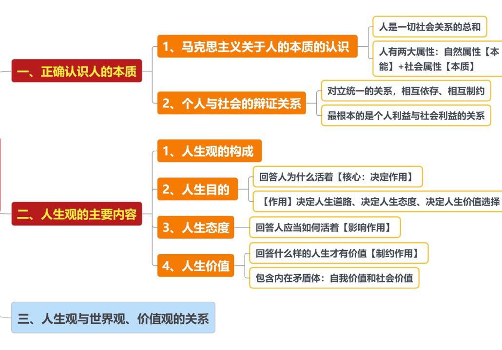 人生观的主要内容包括人生目的、人生态度和人生价值。人生目的回答人为了什么活着,人生态度回答人应当如何活着,人生价值回答什么样的人生才有价值。这三个方面相互联系、相辅相成,统一为一个有机整体。