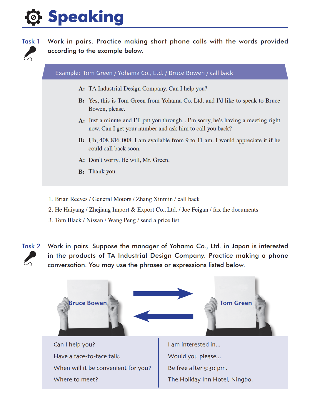 Task 3 MartinJones has to attend an important conference next Monday morning and he callsWang Ning to rearrange the time. Listen to the conversation and choose the best answer to each question.