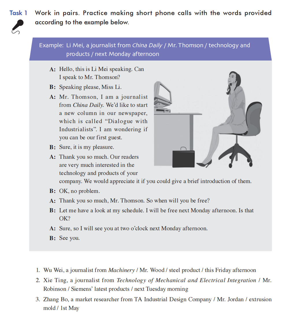 Work in pairs. Practice making short phone calls with the words provided according to the example below.