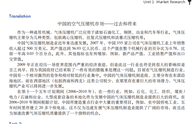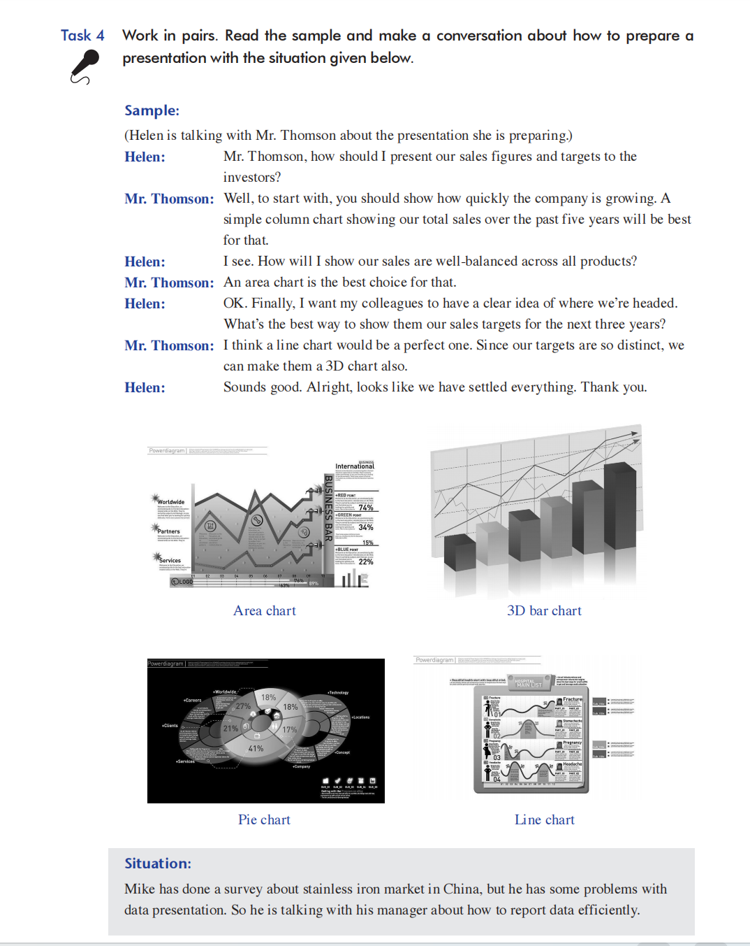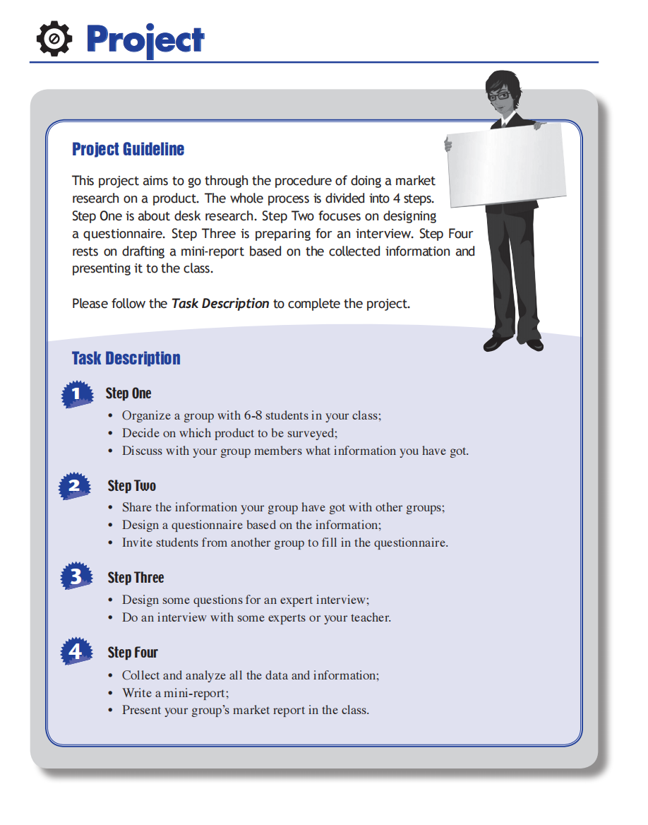 This project is for group work. It is an integrated task that requires Ss to work together to go through the procedure of doing a market research on a product. Ss should know how to collect useful information and analyze the data. They are also required to design a questionnaire and interview. Finally, each group should work out a market report and present it to the class. Each group is given 10-20 minutes to make a presentation of their work in class.