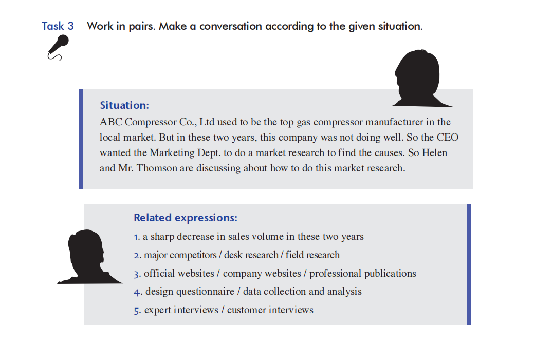 Work in pairs. Li Mei is interviewing Mr. Thomson, an analyst from the Marketing Department of ABC Compressor Co., Ltd. Make a conversation according to the instructions below.