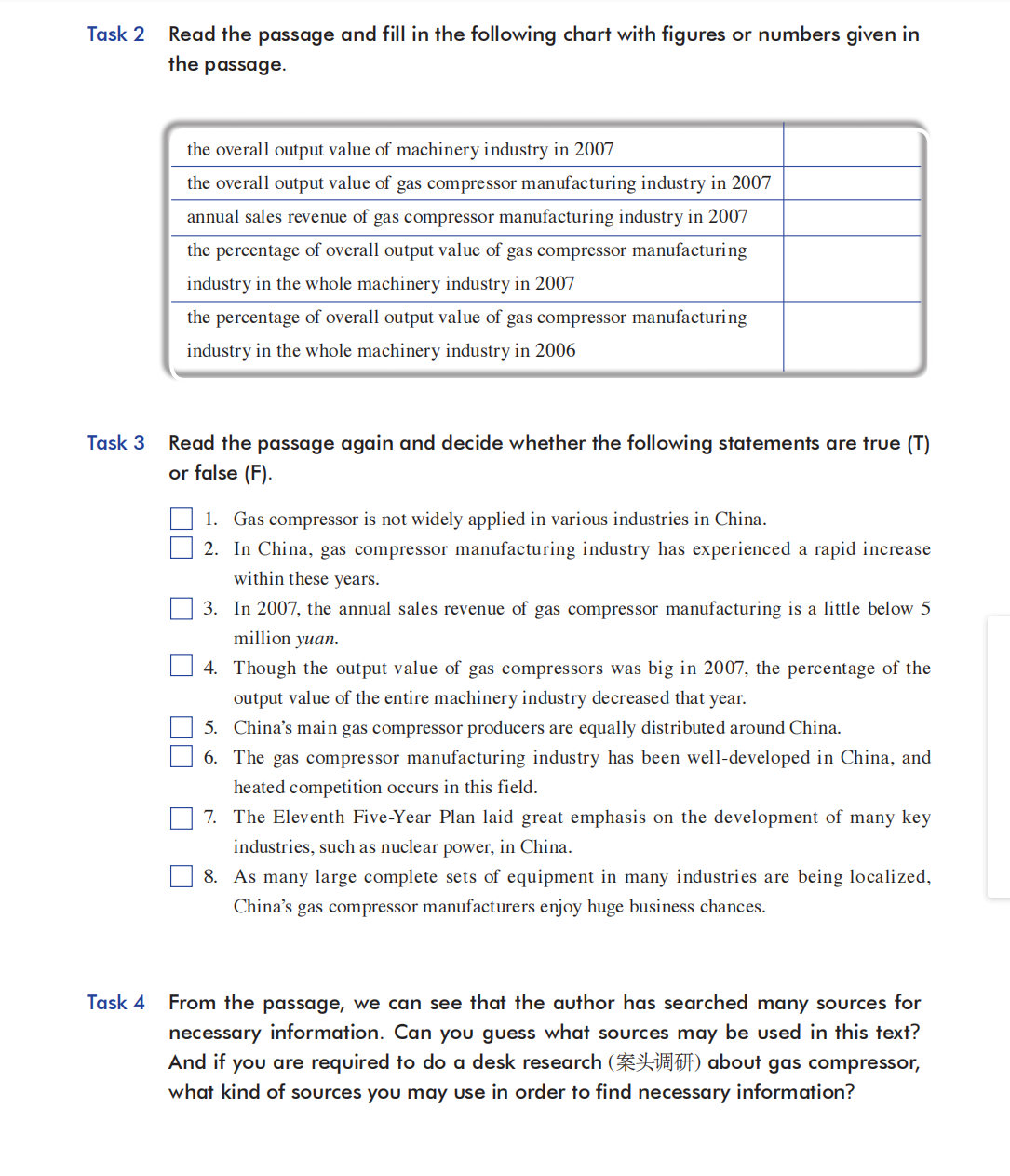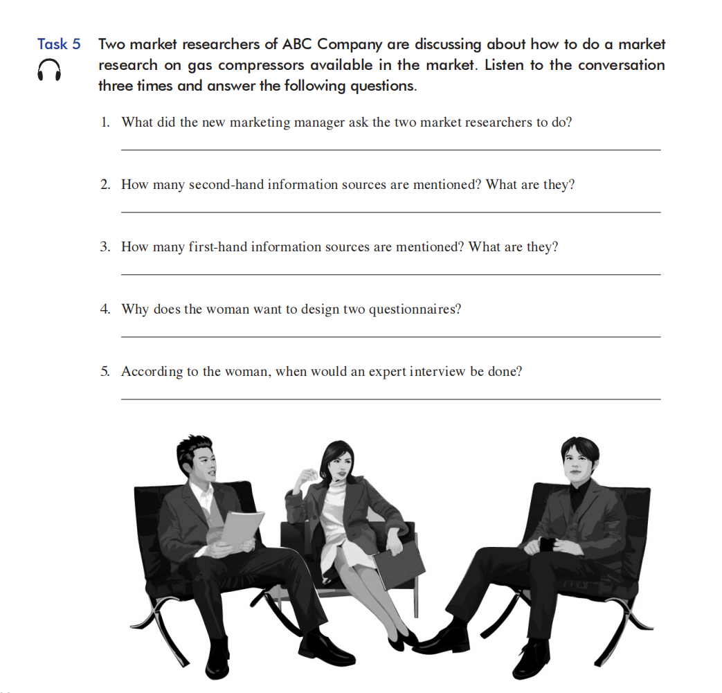 Task 5 Two market researchers of ABC Company are discussing about how to do a market research on gas compressors available in the market. Listen to the conversation three times and answer the following questions.