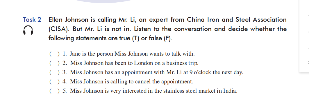 Task 2 Ellen Johnson is calling Mr. Li, an expert from China Iron and Steel Association (CISA). But Mr. Li is not in. Listen to the conversation and decide whether the following statements are true (T) or false (F).