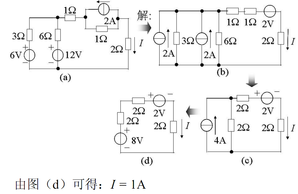 例 1: 试用电压源与电流源等效变换的方法计算 2W电阻中的电流。