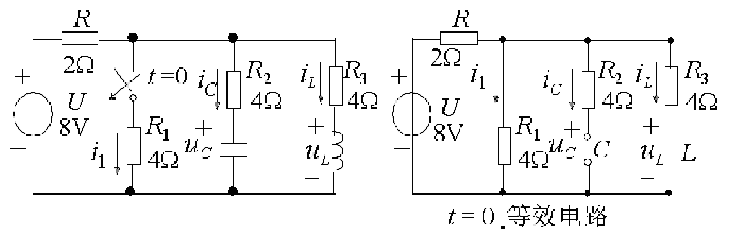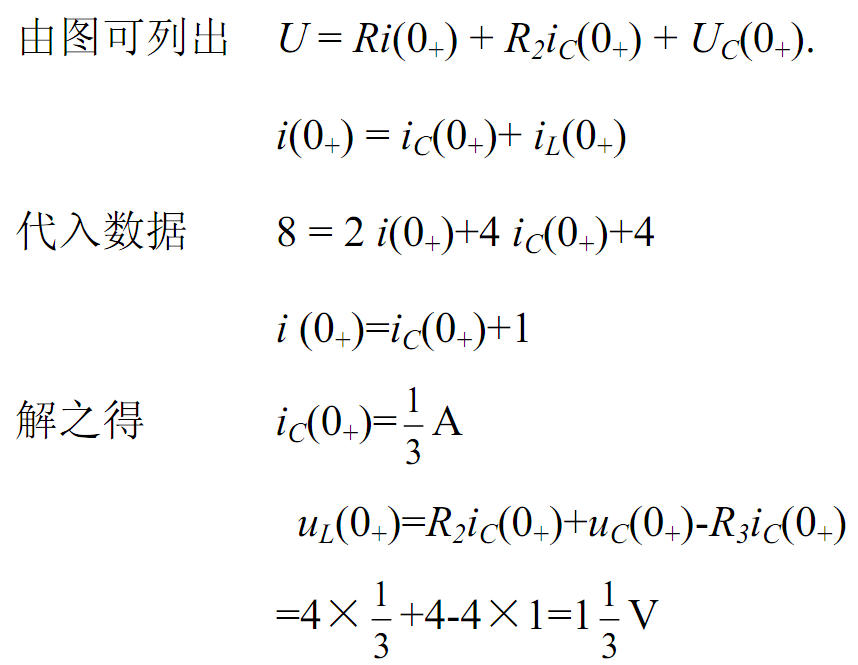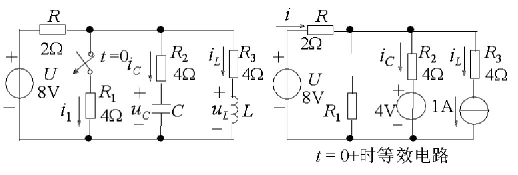 源iL(0+)替代),由t=0+电路求iC(0+)、uL(0+)