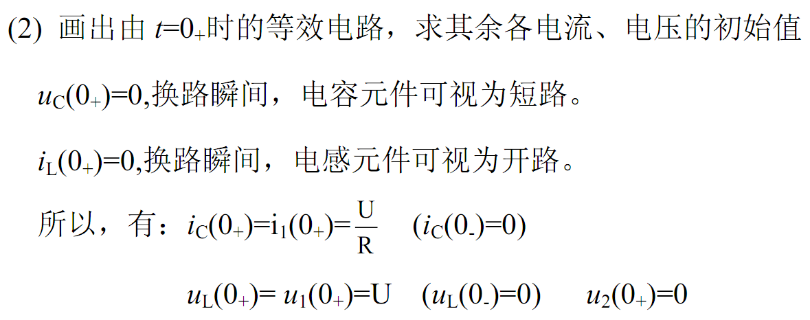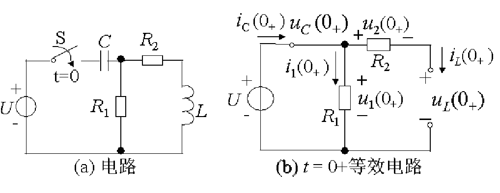 (2) 画出 t = 0+时的等效电路(电容用电压源 uC(0+)替代,电感用电流