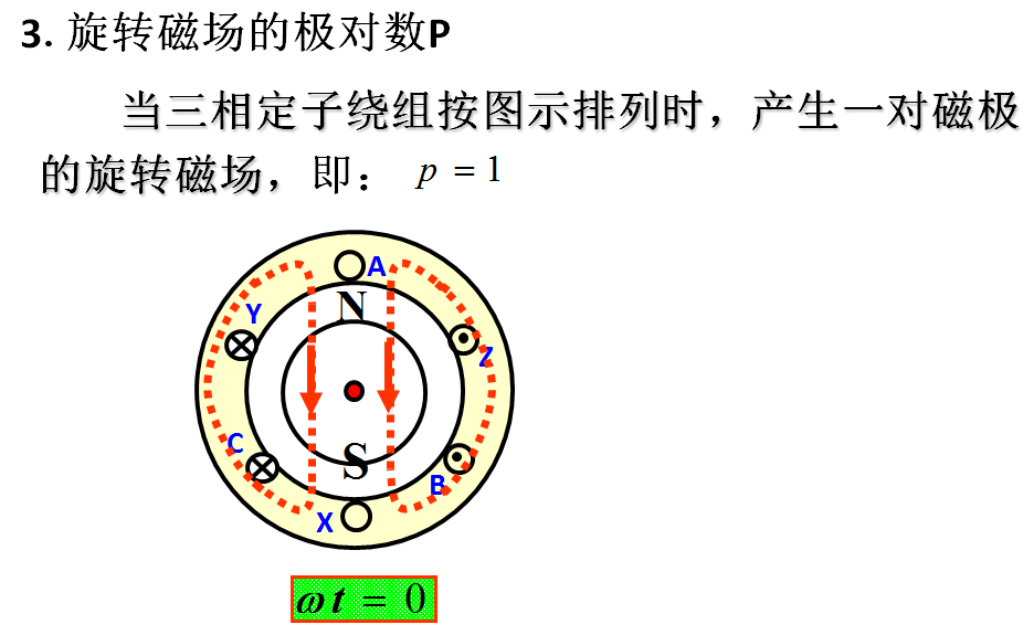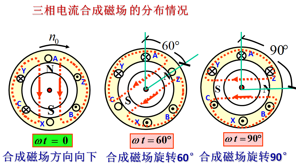 分析可知:三相电流产生的合成磁场是一旋转的磁场,即:一个电流周期,旋转磁场在空间转过360°。