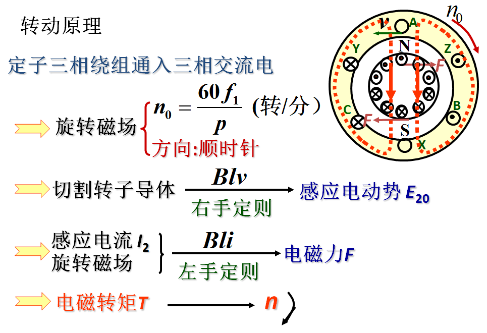定子三相对称绕组以星形或三角形接法通入三相对称电流,产生旋转磁场,磁力线穿过定子和转子铁心而闭合,且以转速n0旋转。转子绕组切割旋转磁场磁力线产生感应电动势,并在短路绕组内形成转子电流。转子电流又与旋转磁场相互作用产生电磁力,,形成转动力矩,使转子以转速n跟随旋转磁场转动,带动机械负载。