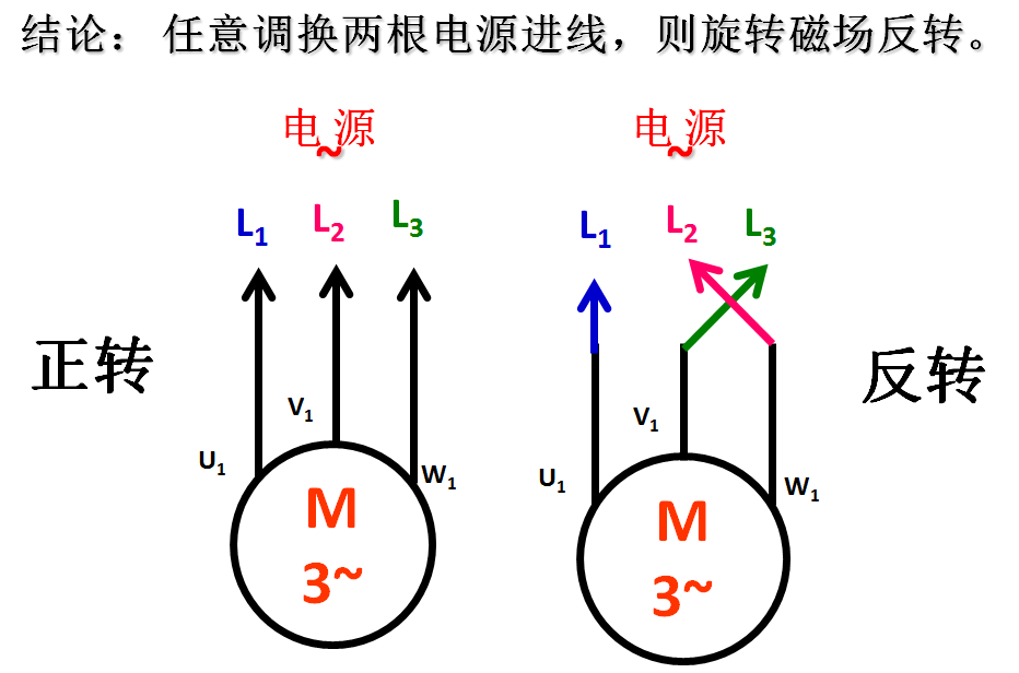 当任意改变相序的其中两相,则旋转磁场方向改变。