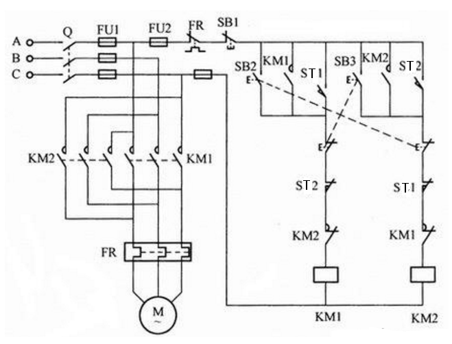 当按下正转起动按钮SB2时,电动机正向起动旋转,小车向左运动,当小车压下行程开关ST2时,正转接触器KM1线圈断电释放,反转接触器KM2线圈得电并吸合,电动机由正转变为反转,小车向右运动。