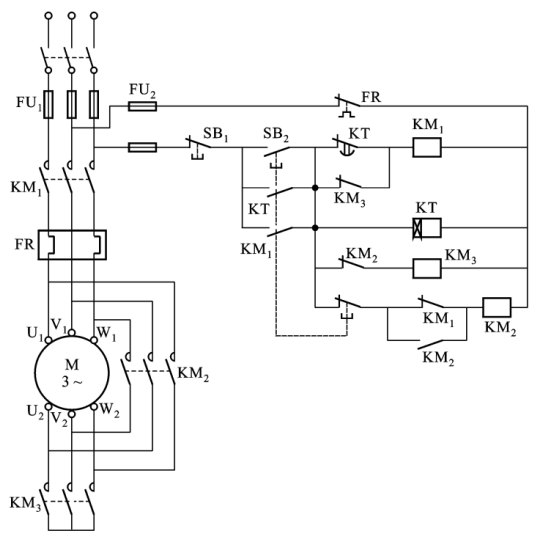 下图是按时间要求控制的笼型电动机Y-△起动控制线路。在其主电路中,接触器KMY用于定子绕组的Y形联结,KM2用于定子绕组△形联结。在其控制电路中,时间间继电器 KT 的延时断开的动断触点串联在 KM3的线圈电路中,延时闭合的动合触点串联在 KM2的线圈电路中。
