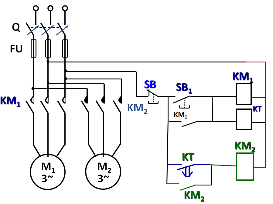 接通电源开关,电动机准备起动。按下起动按钮 SB1,接触器KM1线圈通电,电动机M1先起动,而电动机M2主触点对应的接触器线圈不能得电,因此不能起动。与此同时,时间继电器KT 的线圈也通电,经过预定时间,时间继电器动作:其延时闭合的动合触点闭合,使KM2的线圈得电,于是,电动机M2自行起动。按下停车按钮SB,两台电动机同时停车。