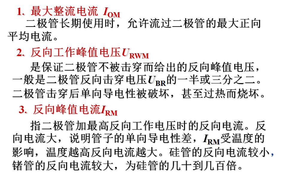 反向特性:加反向电压(称反偏),二极管截止,只有很小的反向电流,呈现反向电阻很大。但反向电压达到反向击穿电压时,二极管被击穿损坏。